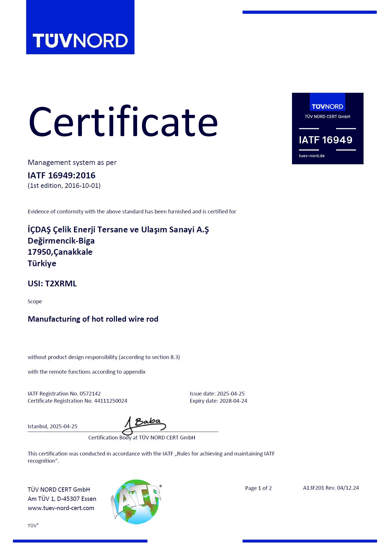 İÇDAŞ IATF 16949 Certificates